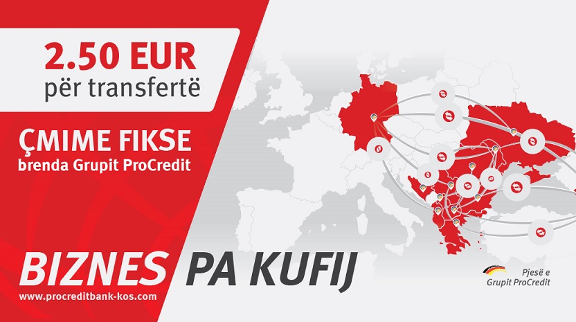 Për çdo transfertë të urdhëruar nga llogaria juaj në Bankën ProCredit në Kosovë në llogarinë e partnerit tuaj të biznesit në rrjetin e bankave ProCredit në Shqipëri, Maqedoni, Bullgari, Serbi, Bosnjë dhe Hercegovinë, Gjeorgji, Gjermani, Rumani, Ukrainë etj, do të paguani vetëm 2.5 Euro, pavarësisht shumës së transfertës.