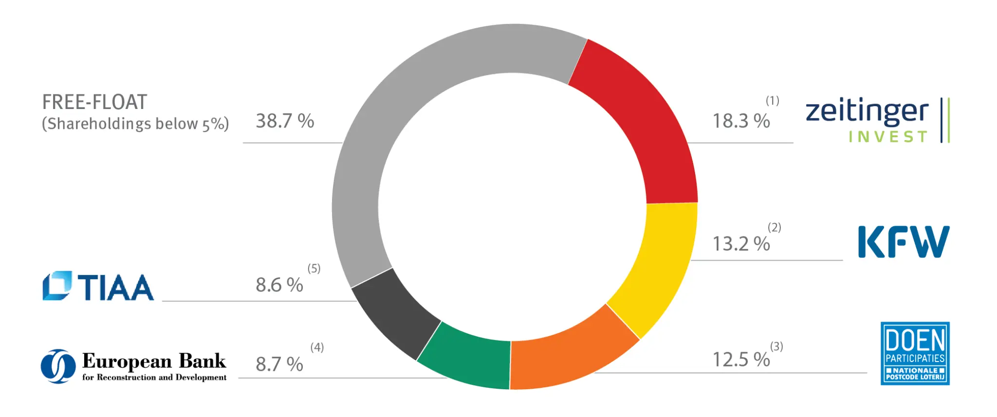 (1) Sipas deklarimeve vullnetare të Zeitinger Invest më 13 prill 2023 (shih “Informacione tjera” në seksionin “Marrëdhëniet me investitorë” të faqes së internetit të ProCredit Holding); (2) Sipas deklarimeve vullnetare të KfW më 17 prill 2023 (shih “Informacione tjera” në seksionin “Marrëdhëniet me investitorë” të faqes së internetit të ProCredit Holding);(3) Sipas deklarimeve vullnetare të DOEN Participaties më 14 prill 2023 (shih “Informacione tjera” në seksionin “Marrëdhëniet me investitorë” të faqes së internetit të ProCredit Holding); (4) Sipas njoftimeve për të drejtat e votës deri më 23 maj 2023; (5) Sipas njoftimeve për të drejtat e votës deri më 29 dhjetor 2016. Struktura e aksionarëve e paraqitur më sipër bazohet në njoftimet publike për të drejtat e votës nga BERZH-i (EBRD) dhe TIAA dhe, në rastin e Zeitinger Invest GmbH, KfW dhe DOEN Participaties B.V., në deklarimet vullnetare për të drejtat e votës (shih “Njoftimet për të drejtat e votës” dhe “Informacione tjera” në seksionin “Marrëdhëniet me investitorët”). Ky zbërthim është llogaritur duke krahasuar numrin e të drejtave të votës të raportuara nga aksionarët në datat e sipërpërmendura me numrin total të të drejtave të votës (aktualisht 58,898,492). ProCredit Holding AG ka bërë përpjekje të arsyeshme për të ofruar një pasqyrë reale të strukturës së aksionarëve. Megjithatë, për shkak të kufizimeve në disponueshmërinë dhe verifikueshmërinë e të dhënave, ProCredit Holding AG nuk merr përgjegjësi për saktësinë, plotësinë dhe përditësimin e informacionit të paraqitur këtu.